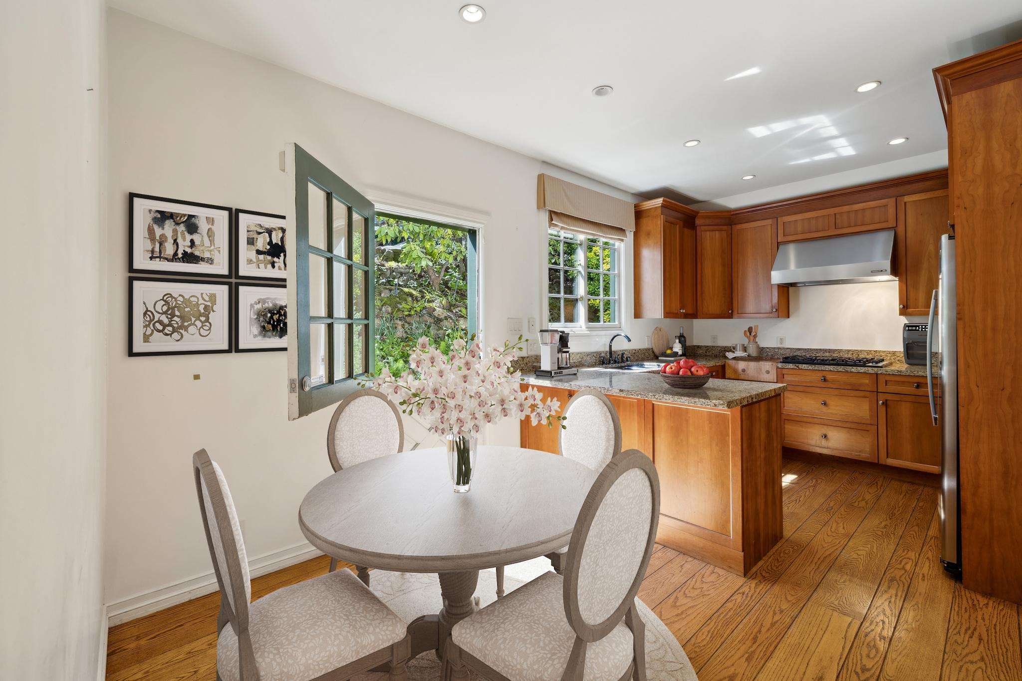 The front door from Glenbrook Avenue, and the garage and kitchen doors from Saint Germain Avenue all lead to the central foyer on this floor. A sizeable living room has beamed ceiling, fireplace and adjacent library area with patio doors opening to the side garden and terrace. There is also an office with view on this level. A formal dining room adjoins the modern kitchen that is adjacent to a butler’s pantry and the powder room.